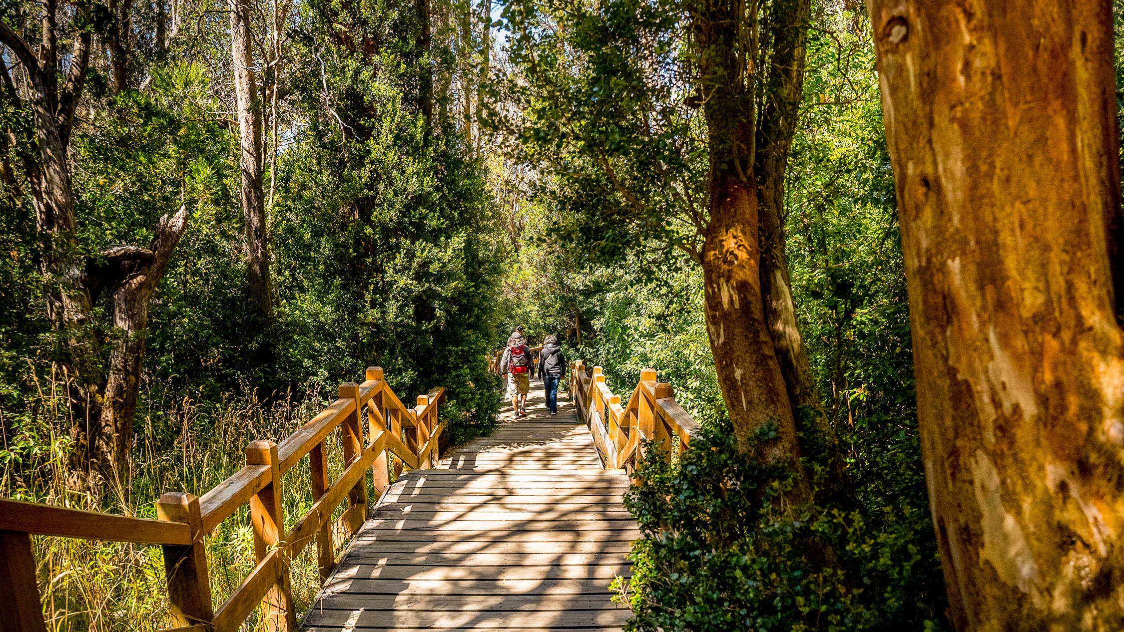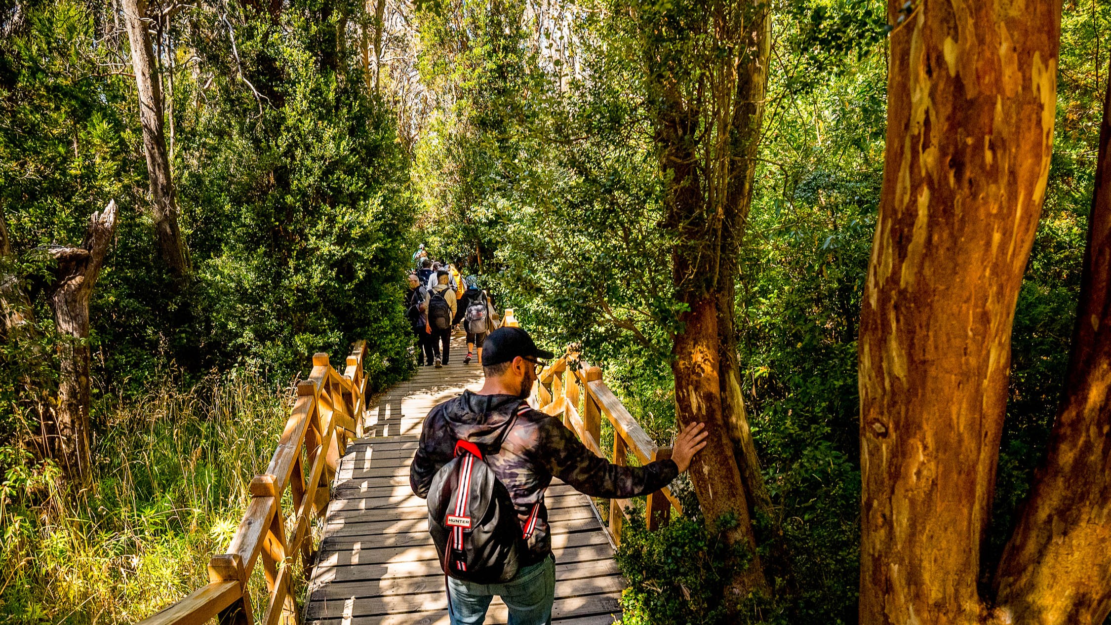 La excursión llega al extremo de la Península de Quetrihué, donde se encuentra el famoso bosque. Allí se dispone de tiempo para recorrer las pasarelas de madera que atraviesan este ecosistema único, formado por árboles de arrayán con su característico color canela y sus formas retorcidas.